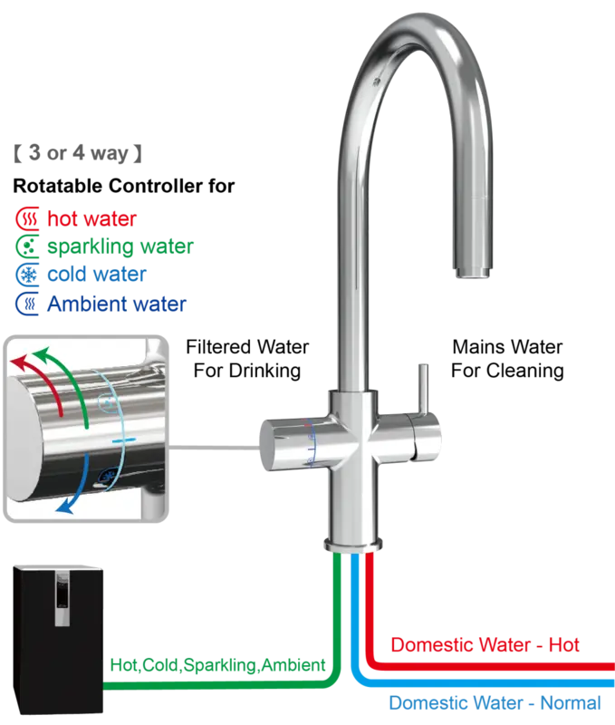 ברז רב-תכליתי — ברז אחד שעושה הכול ומזרים 5–6 סוגי מים: קרים, מוגזים, חמים, מים רגילים לשימוש ביתי (קרים/חמים) ועוד. עשוי נירוסטה SUS 304 לעמידות גבוהה ומראה אלגנטי.